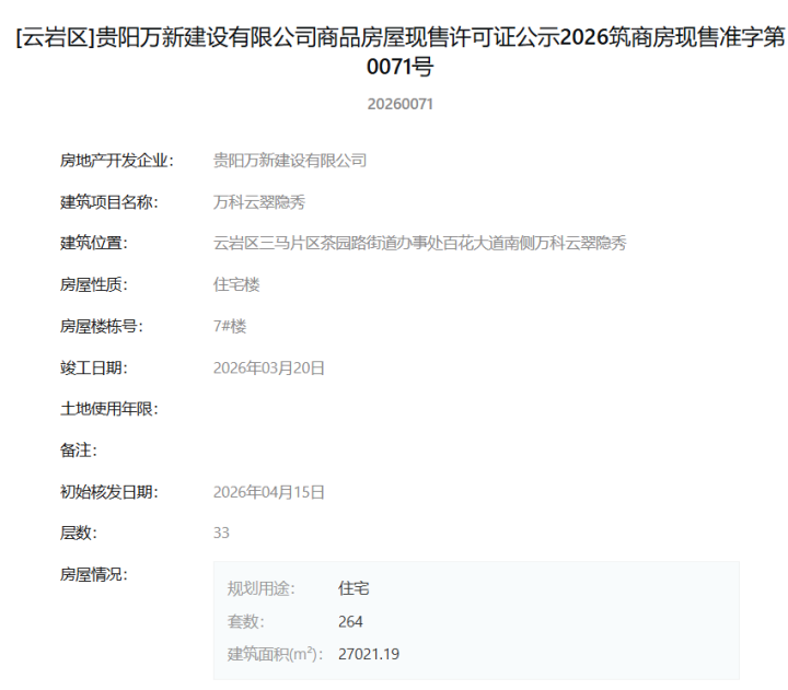 4月17日,据筑房网消息,贵阳万新建设有限公司开发的“万科云翠隐秀”项目7#楼商品房屋现售许可证正式核发,标志着该楼栋已竣工并具备现房销售资格。