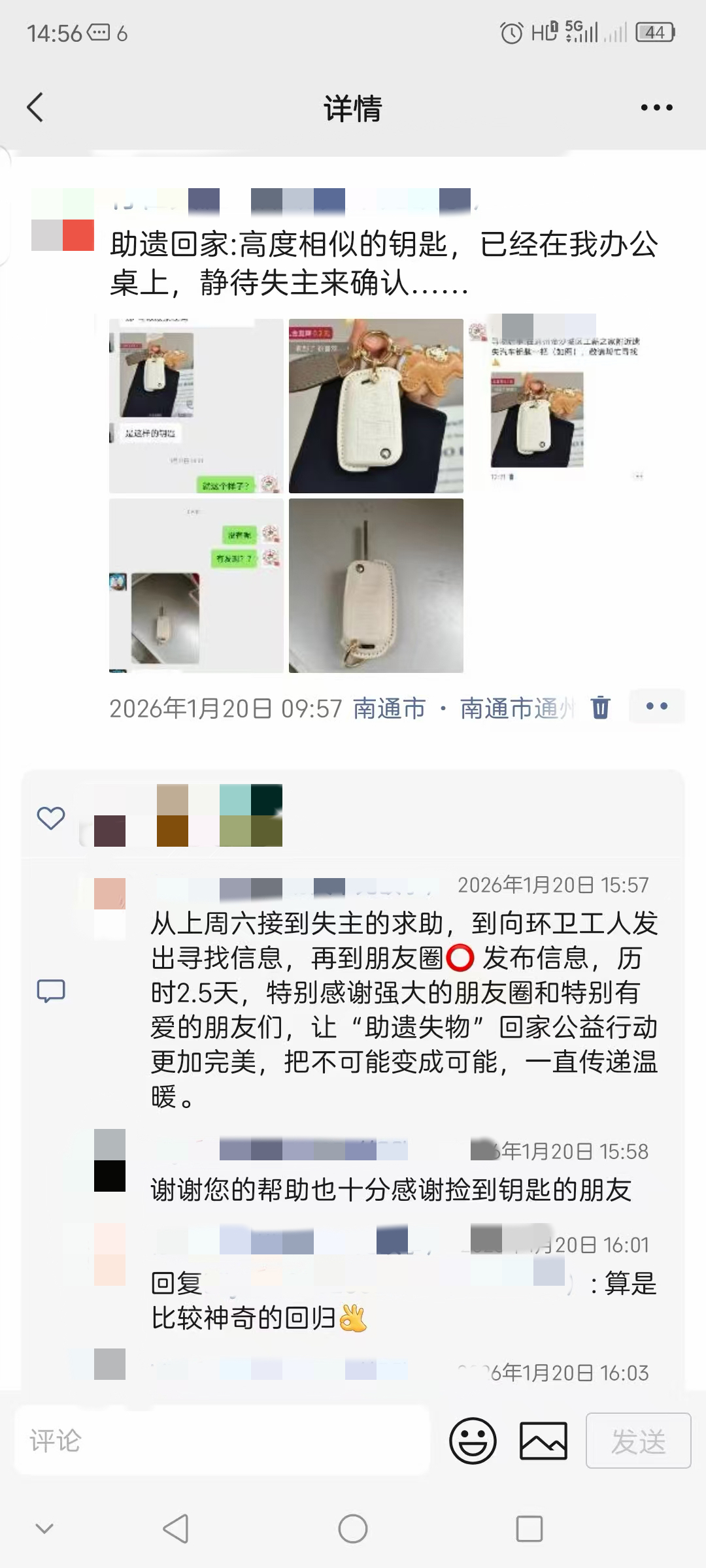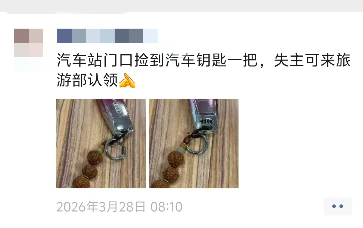 没想到,第二天早晨,在通州飞鹤国旅工作的李鑫像往常一样上班停放车辆时,无意中一瞥,看到地上掉落着一把黑色奥迪汽车的车钥匙。李鑫自己的车钥匙也曾遗失,后来没找到,无奈之下花两千元重新配制,因此感同身受的她捡起后,料想失主同样着急,略作思忖后便拍下钥匙图片发至微信朋友圈,希望圈内好友帮助寻找失主。