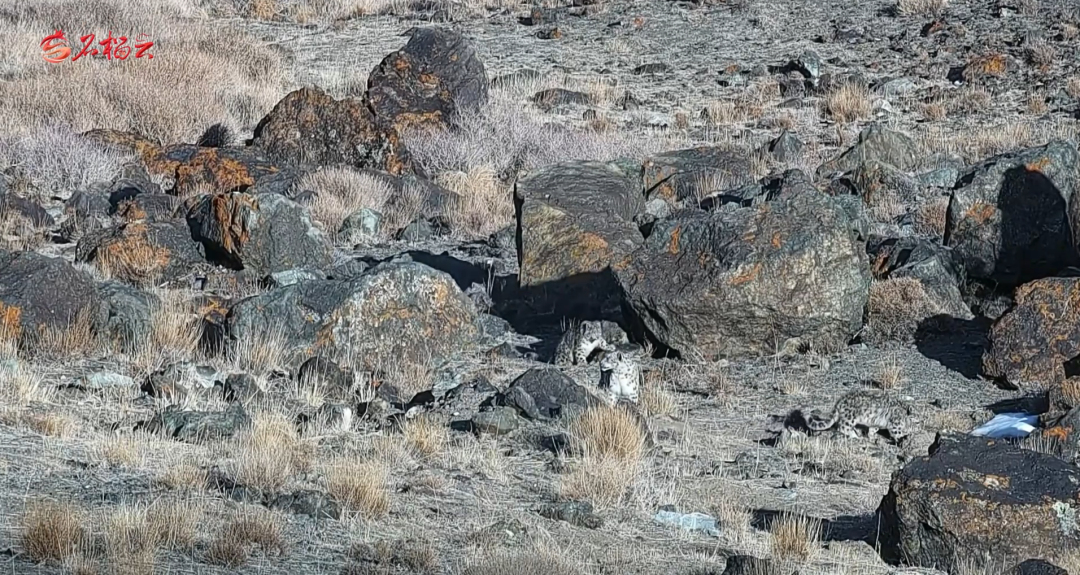当然,这5只雪豹也是出来寻找食物一样,并且往山峰区域活动,其出来的4只小雪豹一直都是跟随雪豹妈妈完全没有离开,偶尔在岩石草丛间撒欢蹦跳、追逐嬉闹的气氛也是拉满了。
